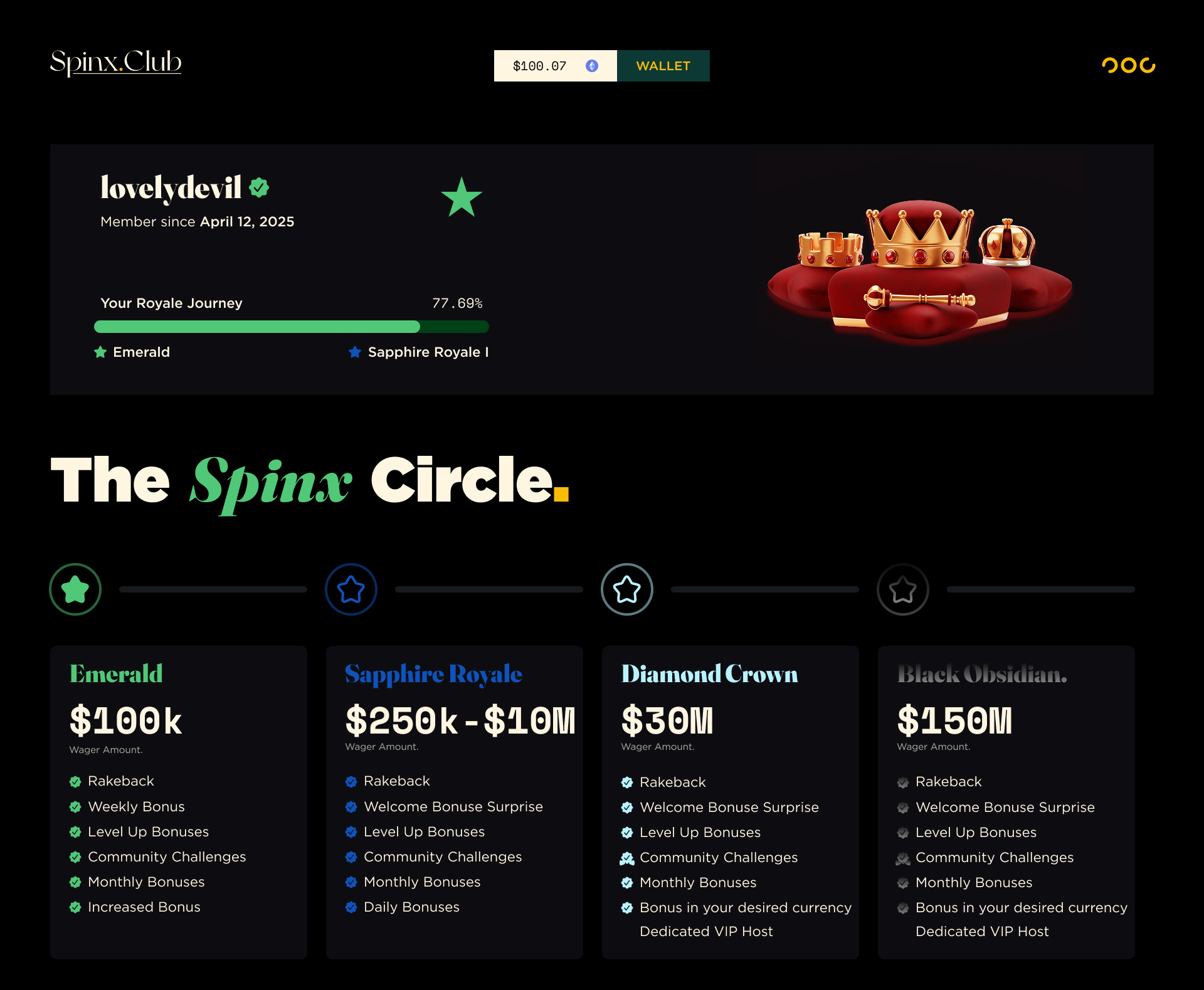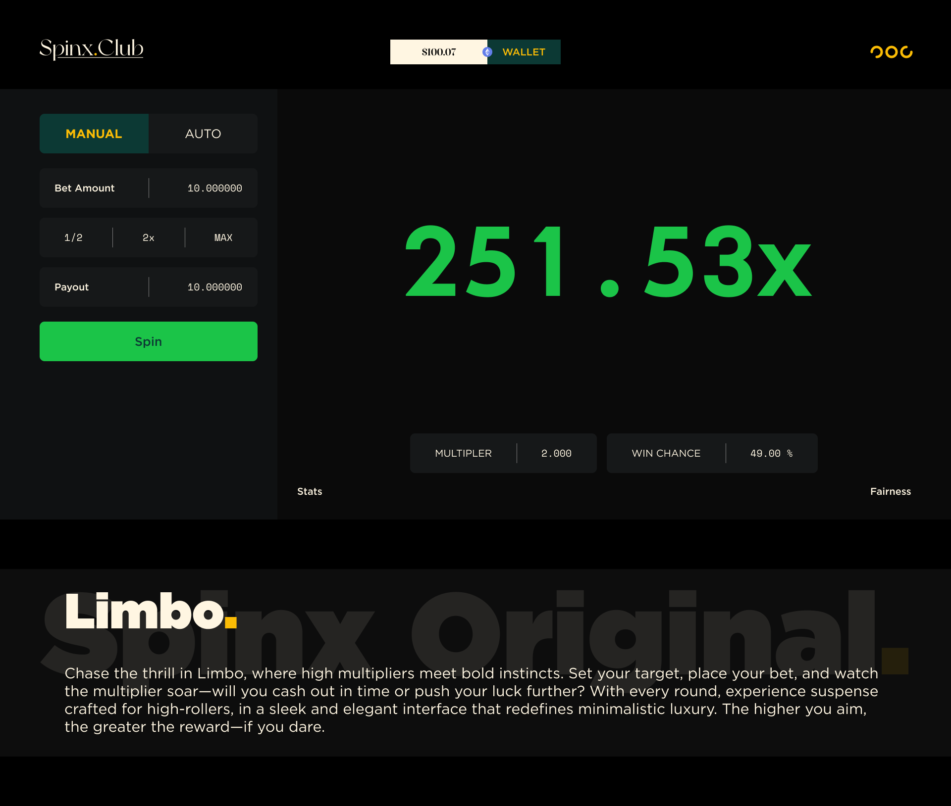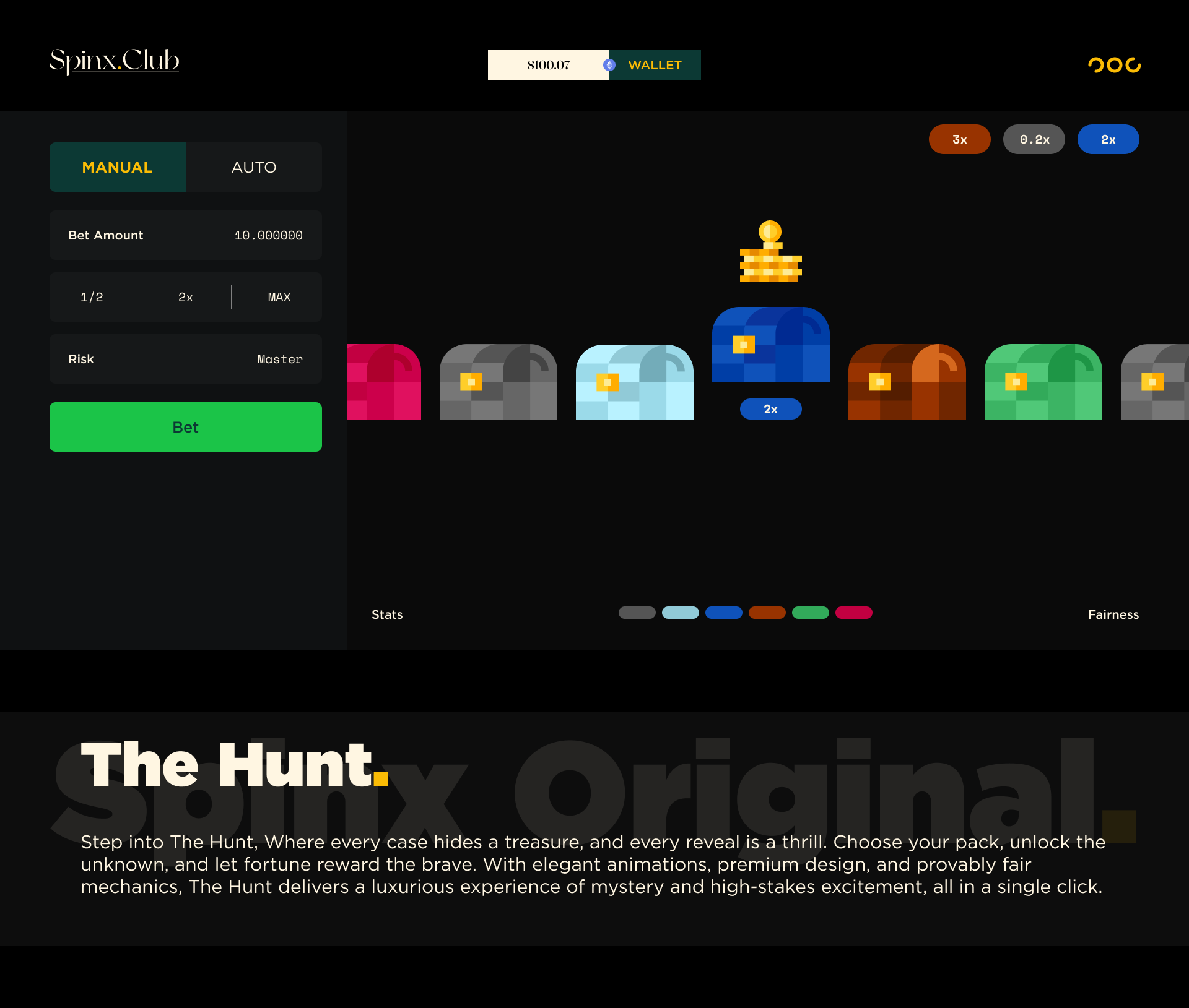 Spinx Club is a luxury crypto-based iGaming platform offering exclusive, provably fair gaming experiences. Designed for high-rollers, it features in-house games with low house edges and loss-based rewards. With VIP perks, rakeback, and competitive bonuses, Spinx Club caters to digital-native players looking for a premium, seamless gambling experience. The platform allows crypto deposits and withdrawals, aiming to create an unmatched environment in the global online gaming market.